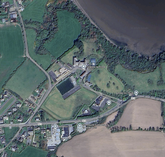 Located in An Rinn in the heart of Gaeltacht na nDéise in west Co. Waterford. It lies ten minutes drive off the national route numbered the N25 which connects Cork city (80Km) and Waterford City (50Km) and further to Rosslare harbour (90Km). There are several exits off the N25 which lead to Gaeltacht na nDéise and to Coláiste na Rinne. The most convenient is the route number R674 which leads off the N25 ten minutes outside the beautiful coastal town of Dungarvan on the Cork side.